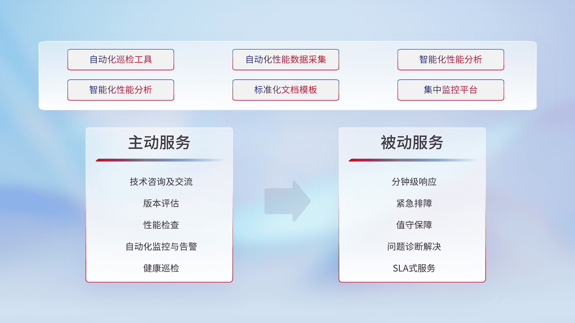智能化工具和标准化文档,,,,保障服务质量,,,,提供主动服务(包含技术咨询、、版本评估、、、、性能检查、、、自动化监控与告警、、健康巡检)和被动服务包含(分钟级响应、、紧急排障、、、值守保障、、、问题诊断解决、、、、SLA服务)。。。